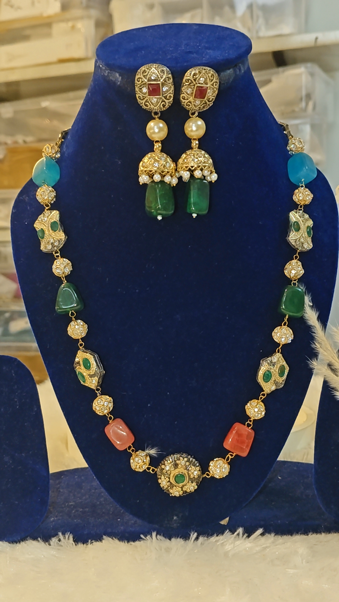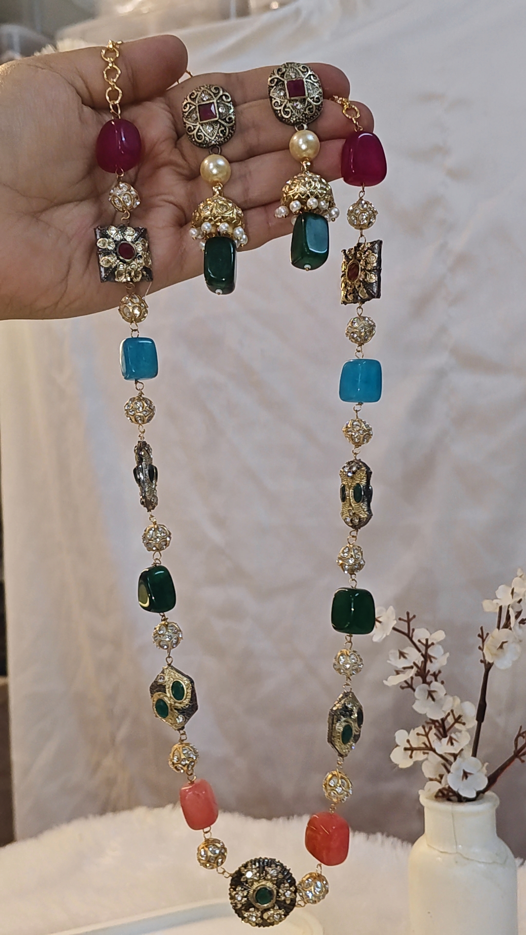 Earrings: Coordinated drop earrings with pearl detailing and colorful stone drops that perfectly complement the necklace.