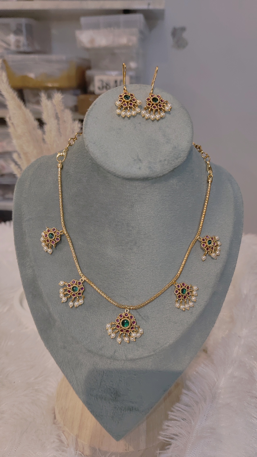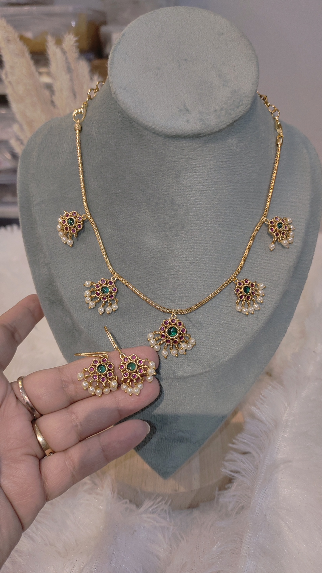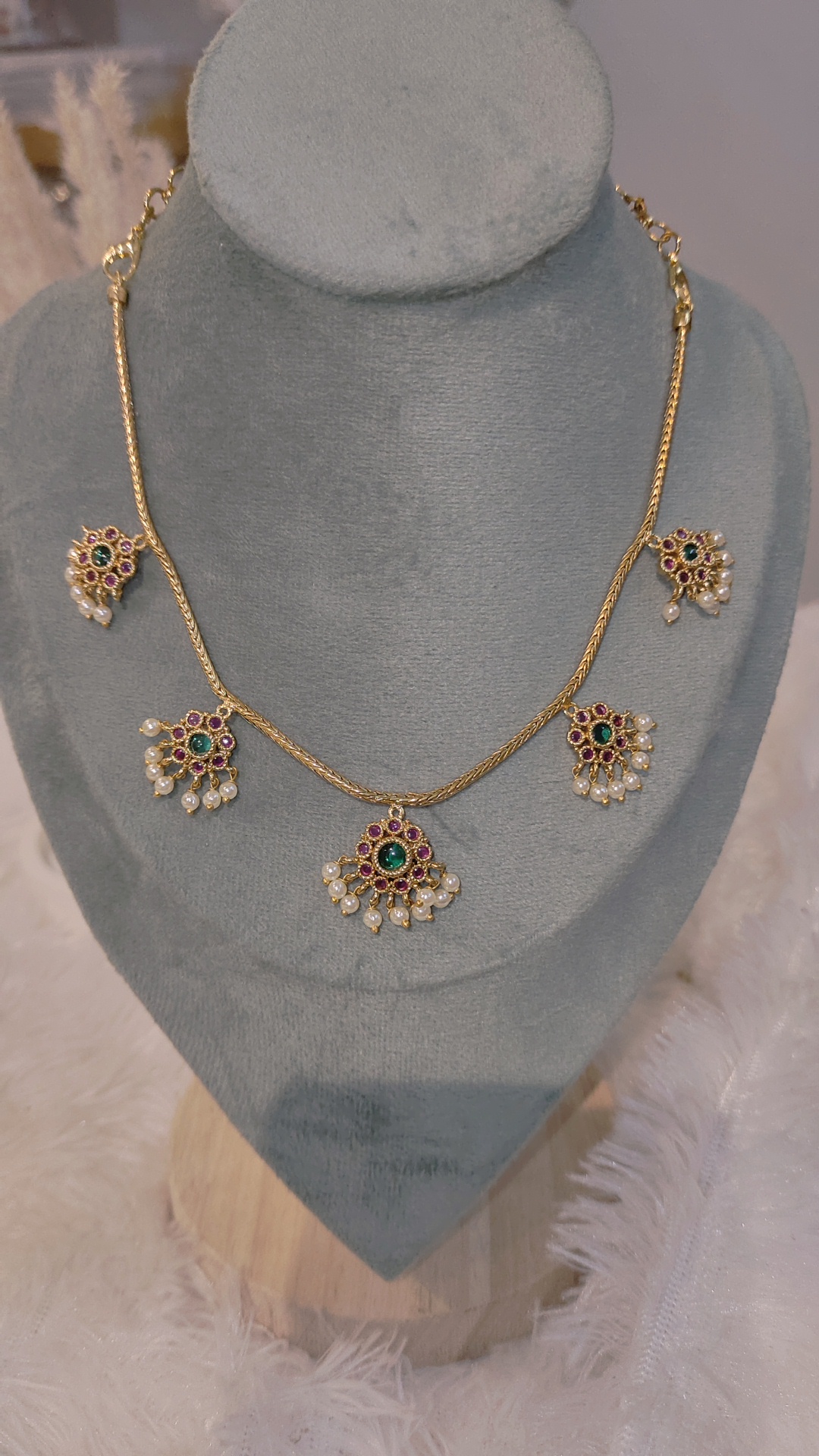 Design & Detailing: The necklace features alternating ruby-red and emerald-green stones set in a floral-leaf pattern, centered with a bold pendant embellished with pearls and beads for added elegance.