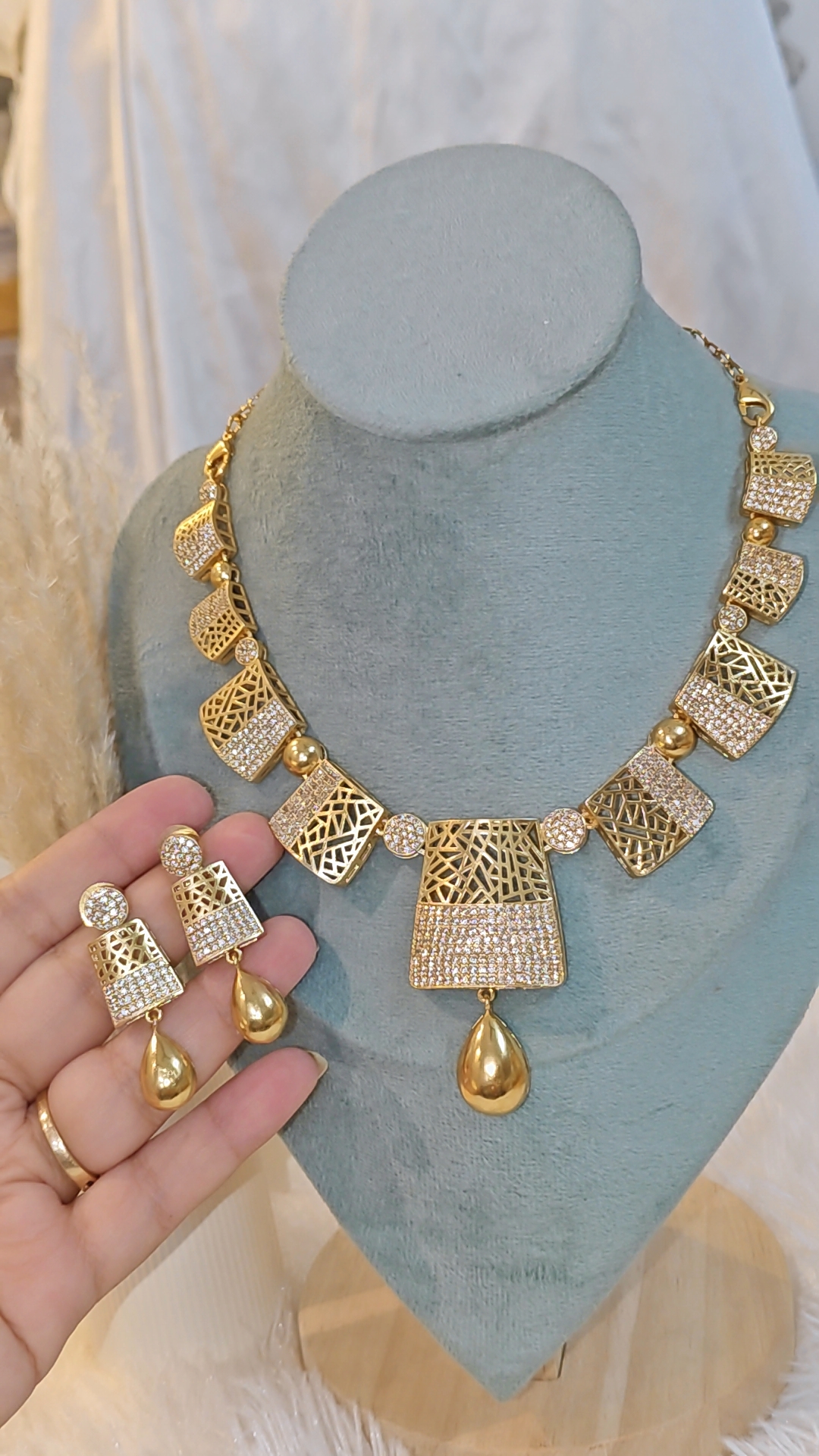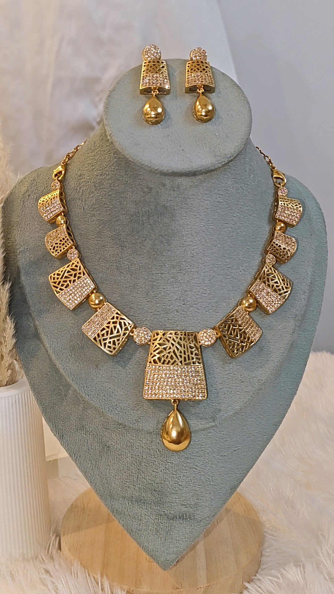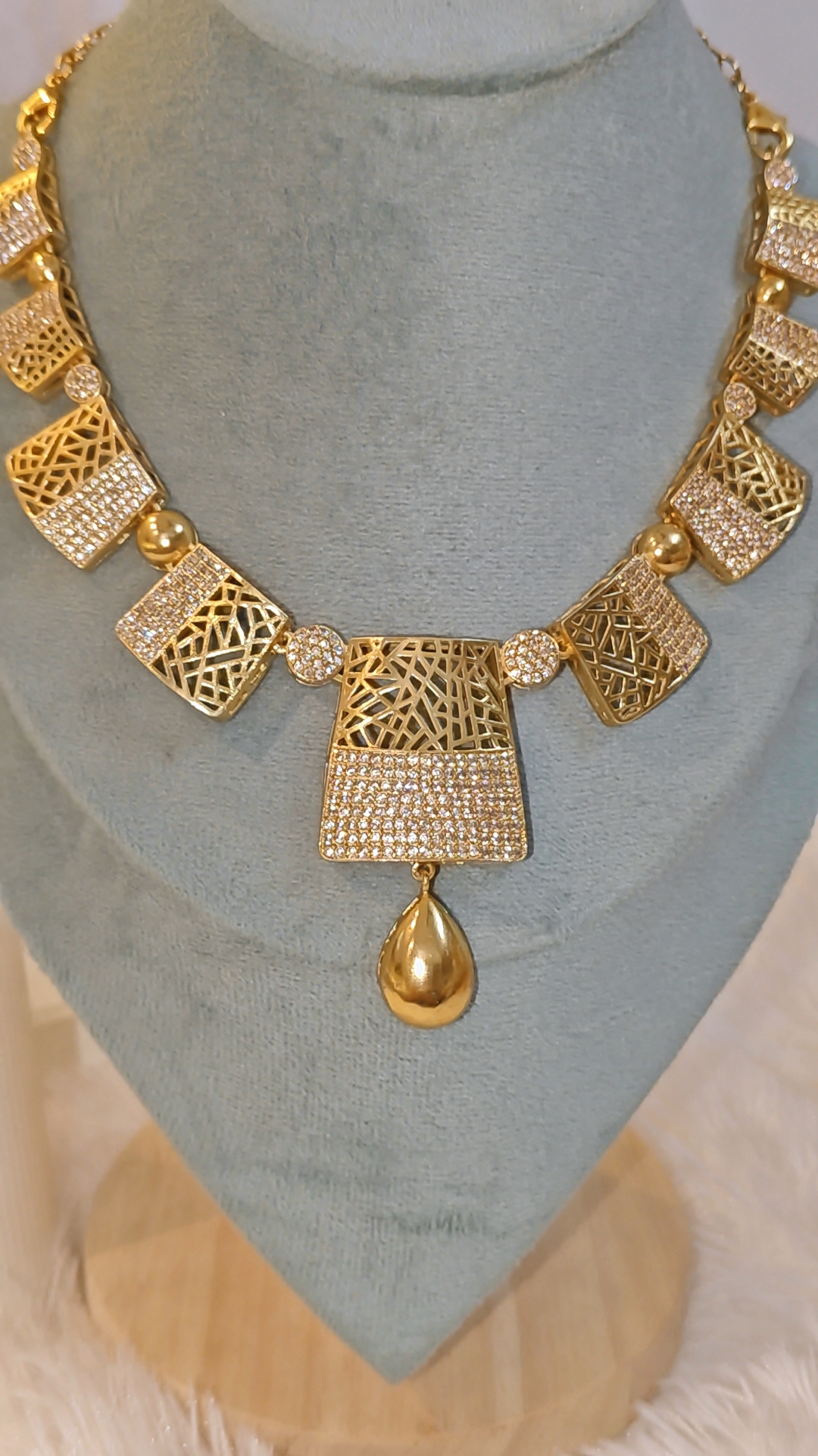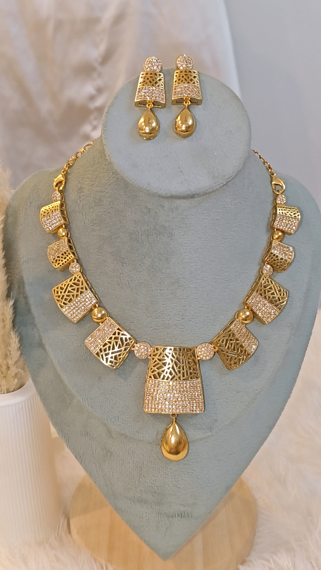 Design: Unique geometrical panels with a mix of open lattice design and sparkling stone embellishments, finished with an elegant golden teardrop pendant.