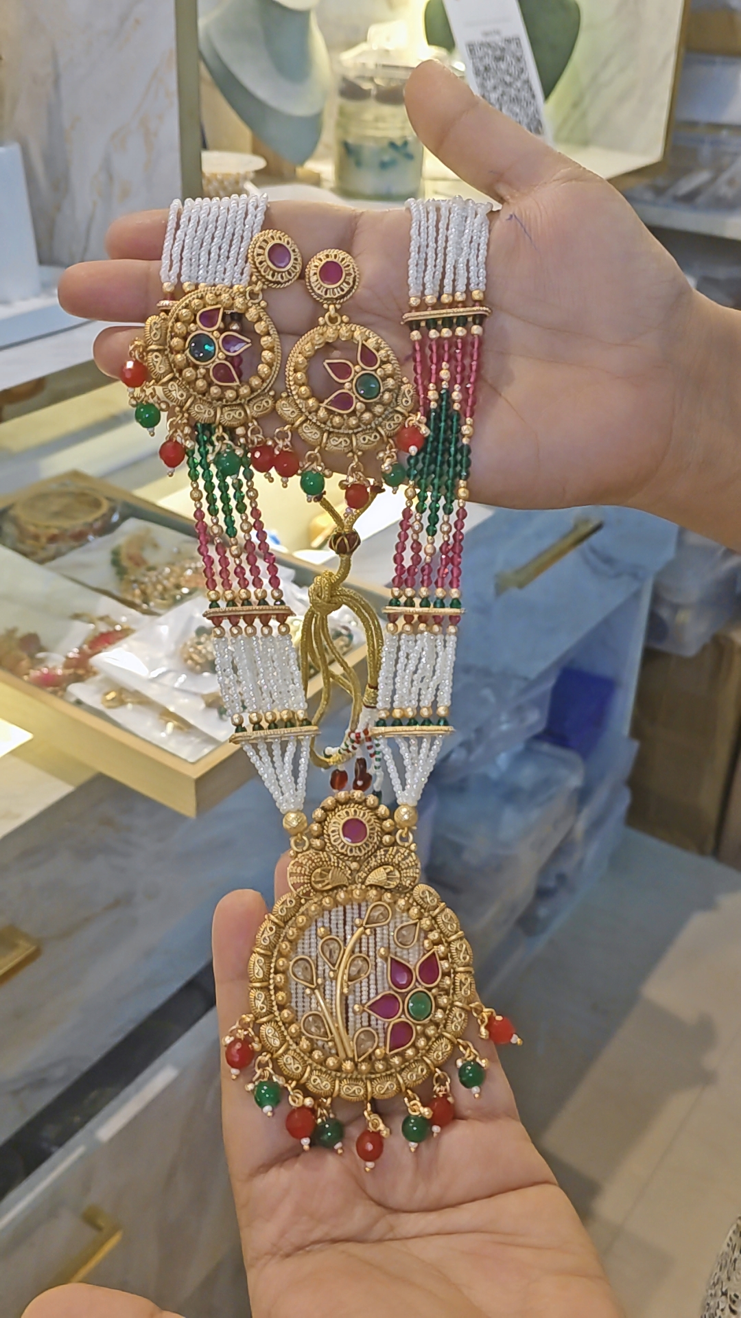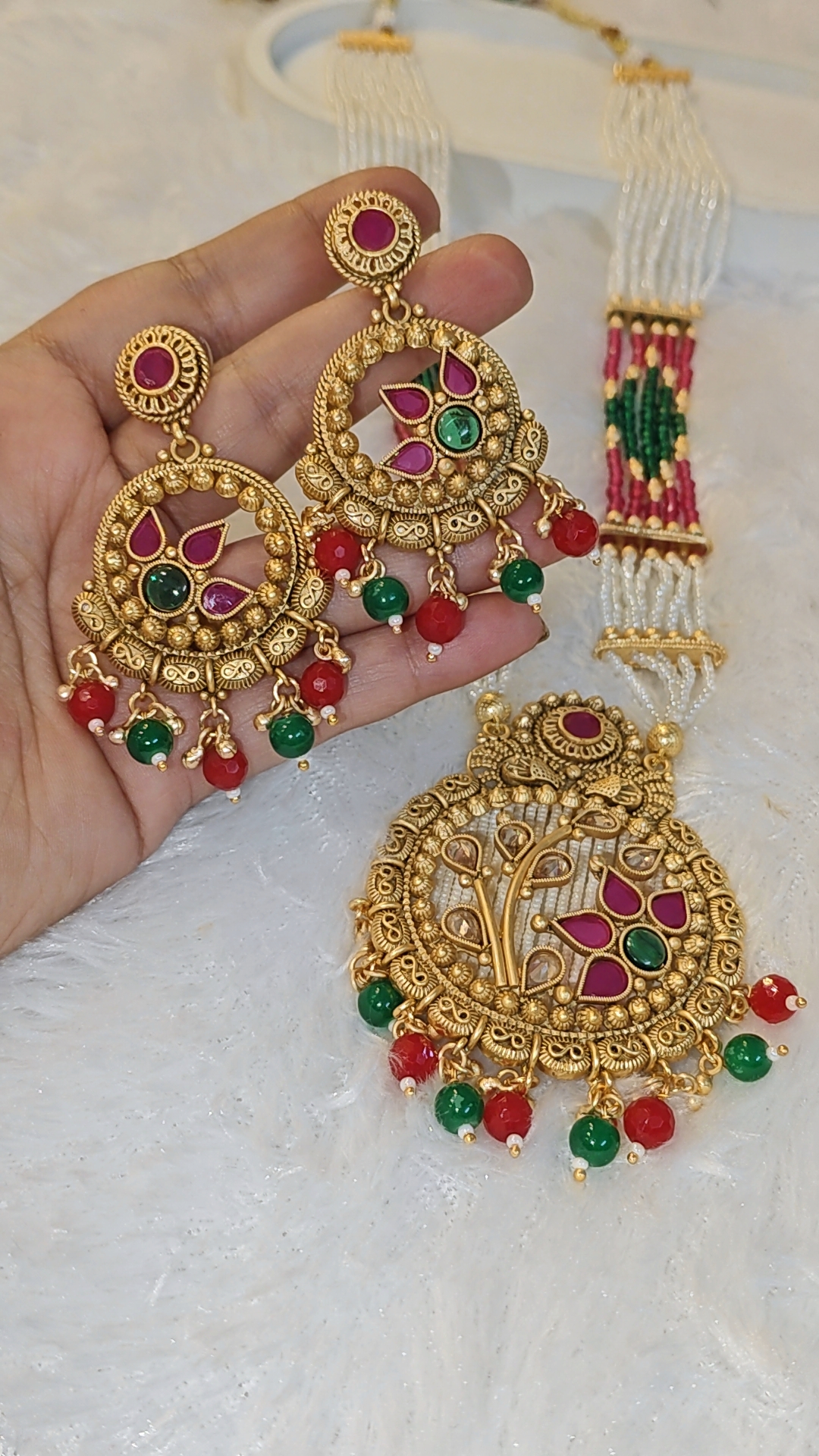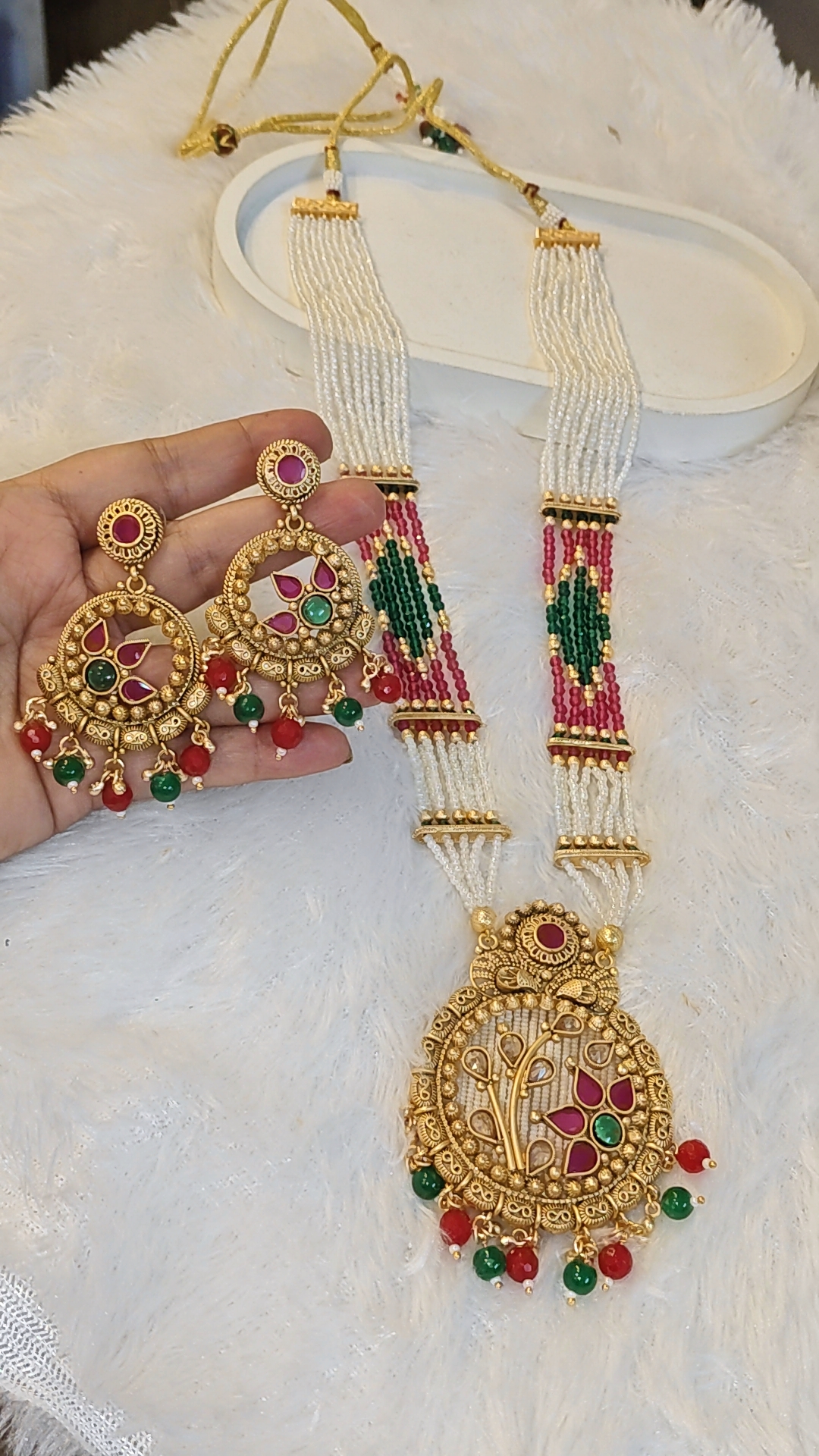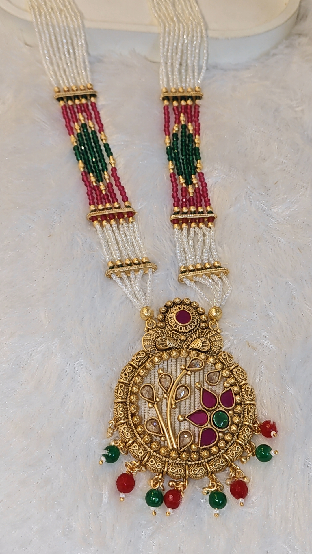 Beads: Multi-strand white beads with green and ruby accents for a vibrant traditional appeal