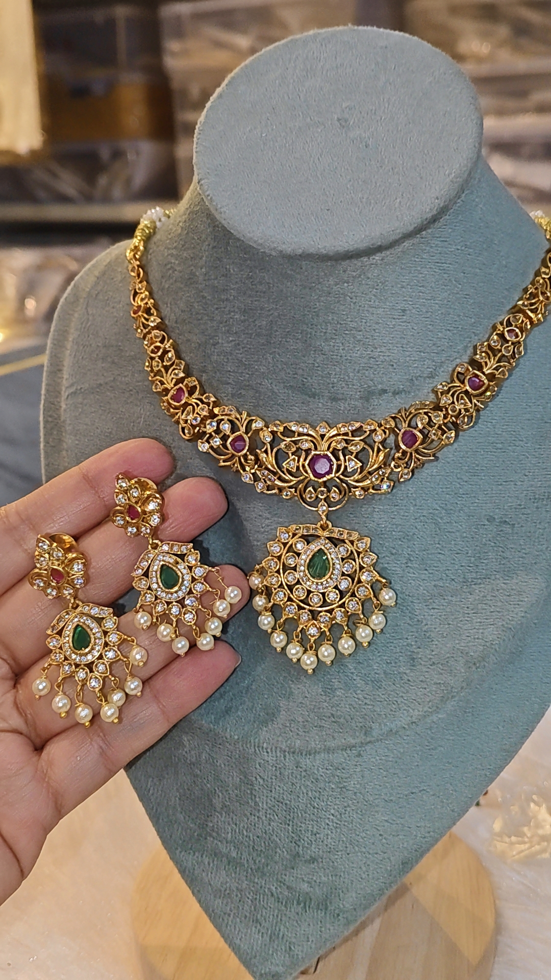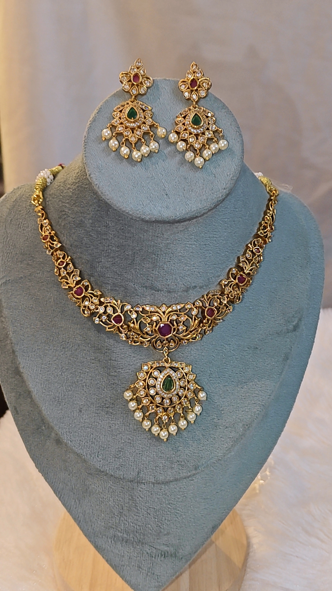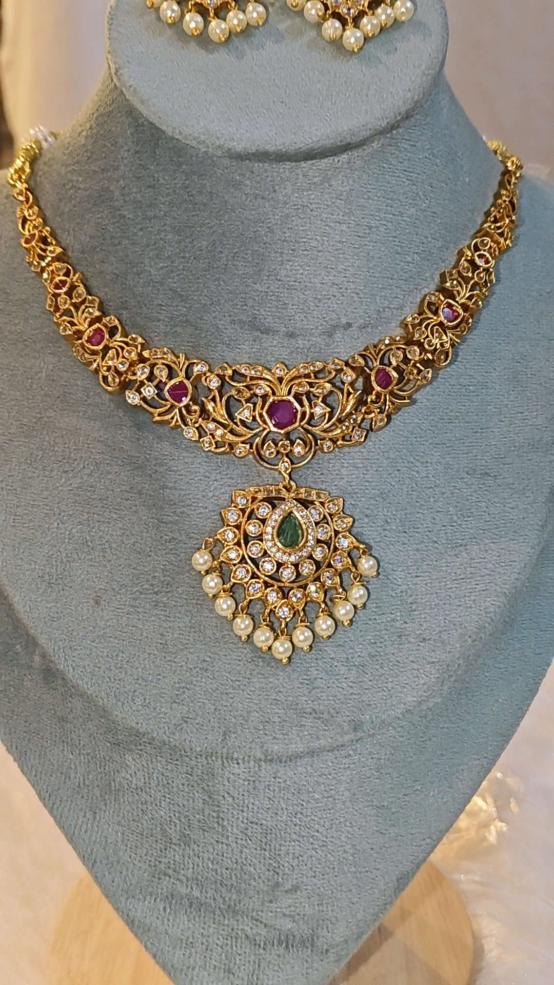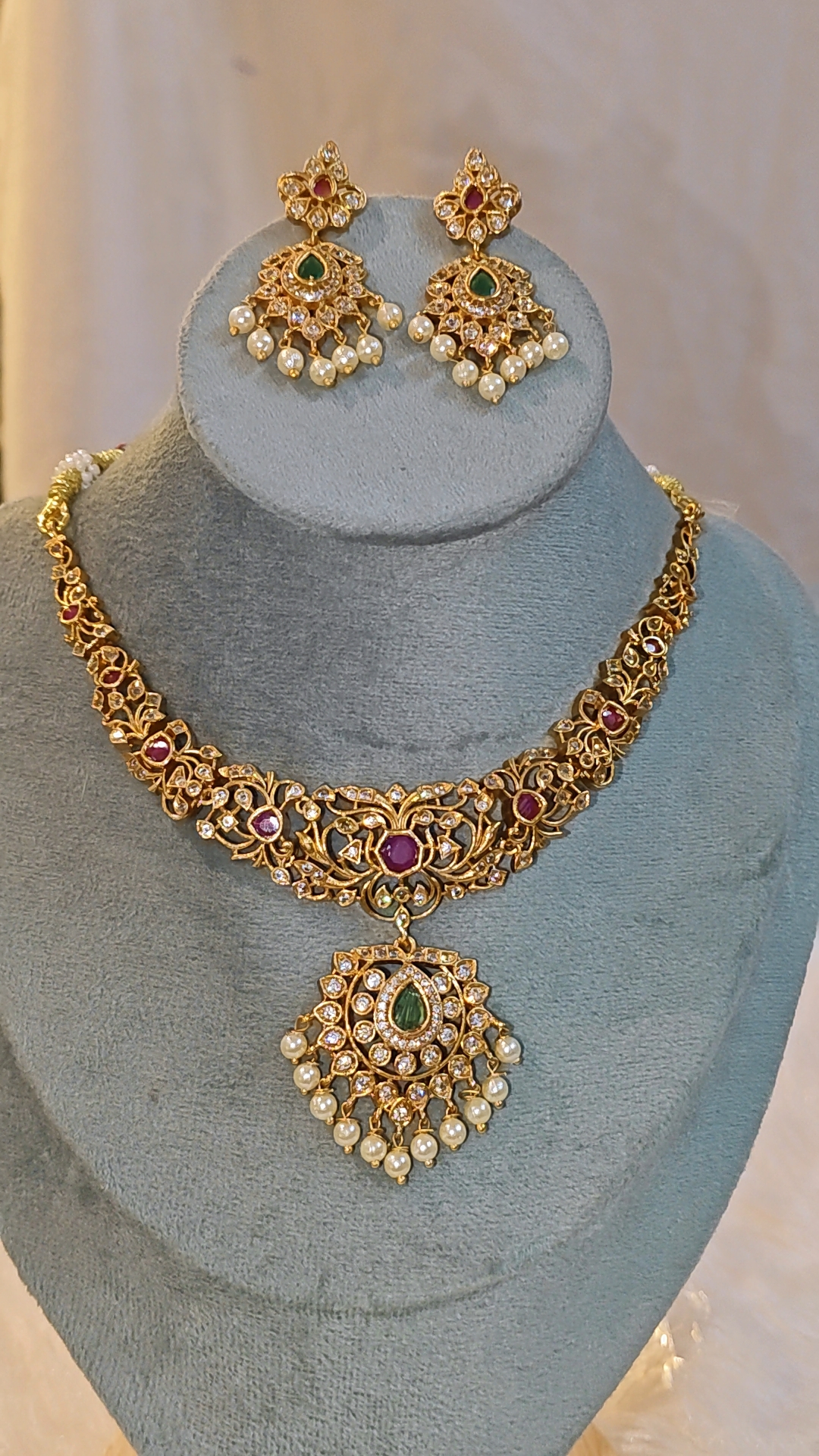 The highlight of the necklace is its beautifully detailed pendant with a teardrop green stone, encircled by shimmering crystals and finished with delicate pearl danglers that sway gracefully with every movement. The matching earrings mirror the same craftsmanship, featuring coordinated stones and pearl drops for a perfectly balanced, traditional look.