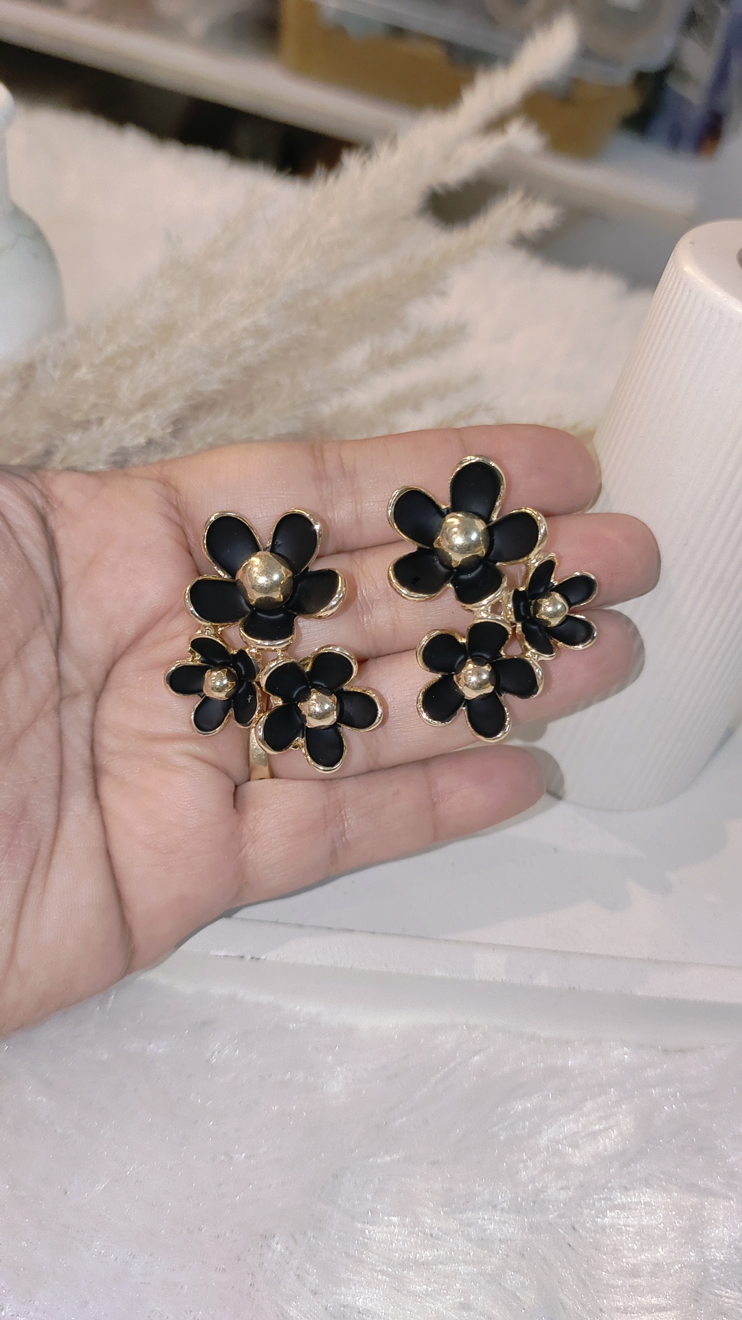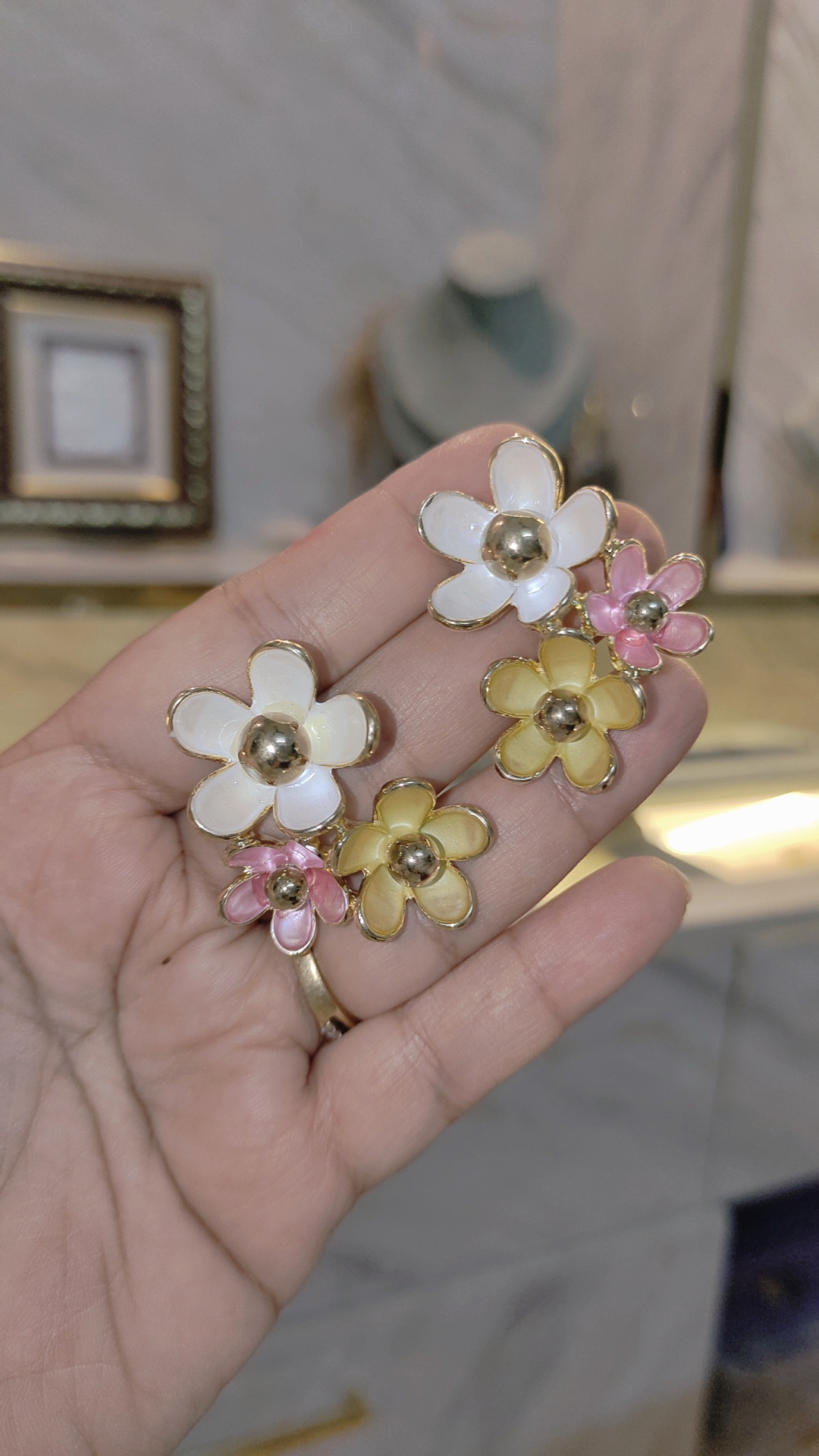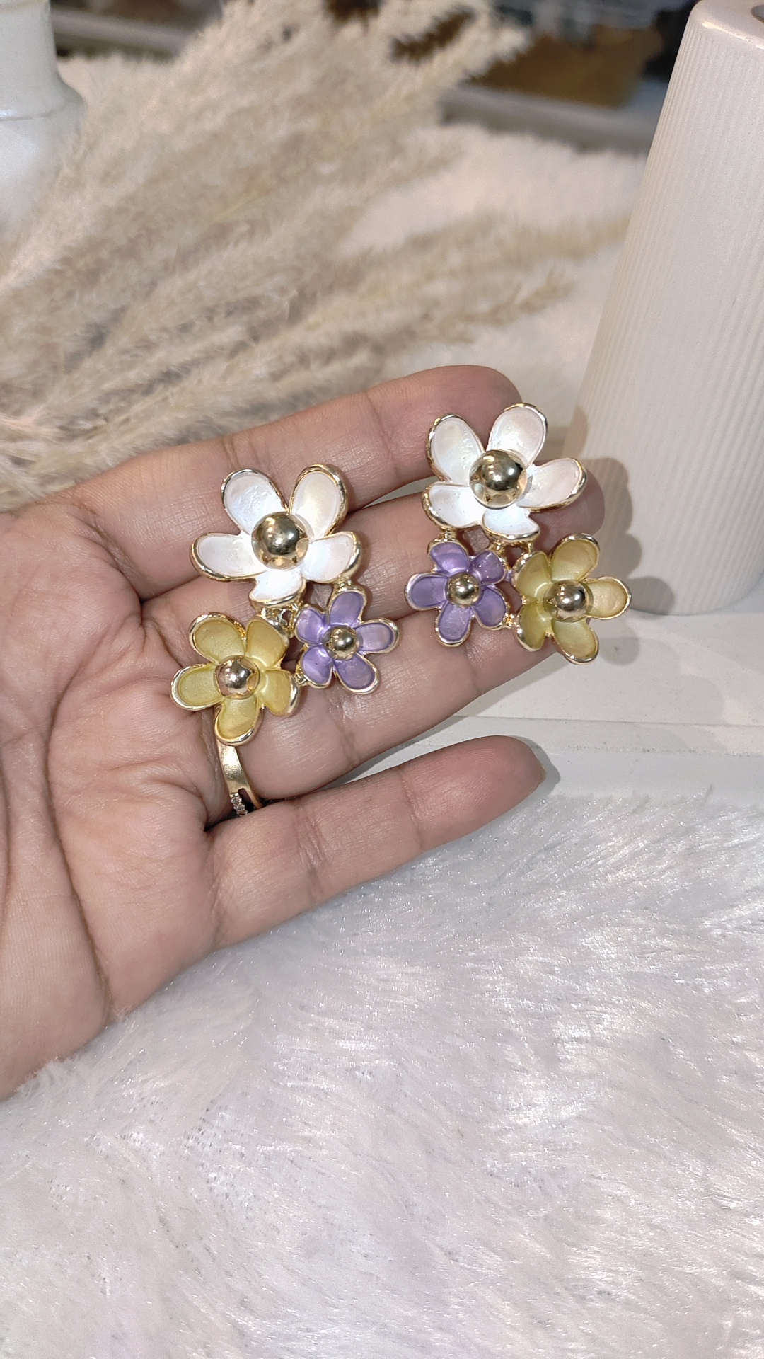 Bring a fresh and elegant vibe to your look with these multi floral statement earrings. Crafted with multiple flower motifs outlined in gold, each petal features a glossy finish with a bold metallic bead center, giving the earrings a chic and modern touch.