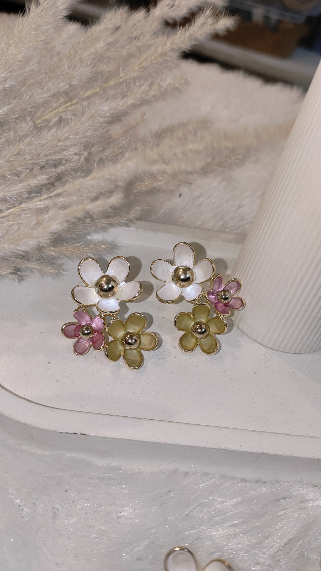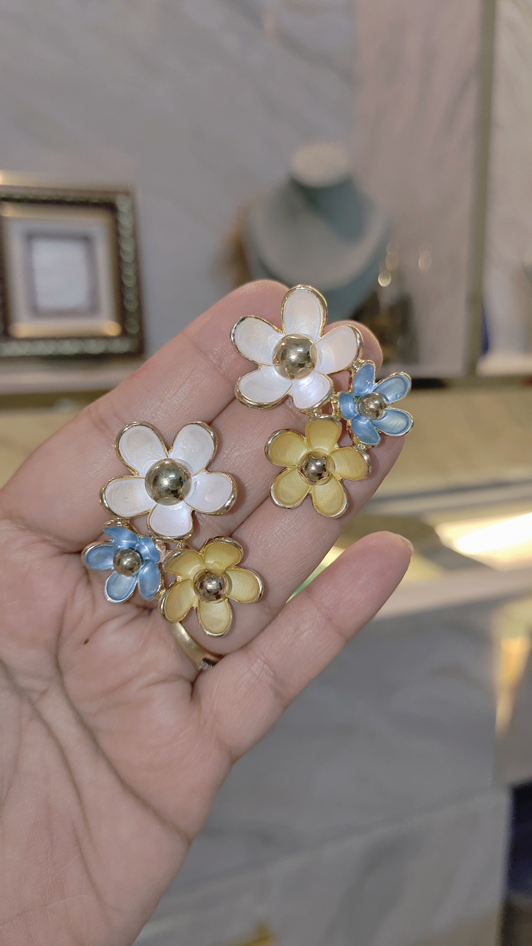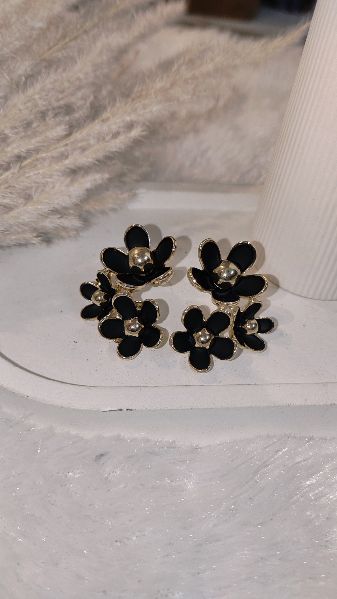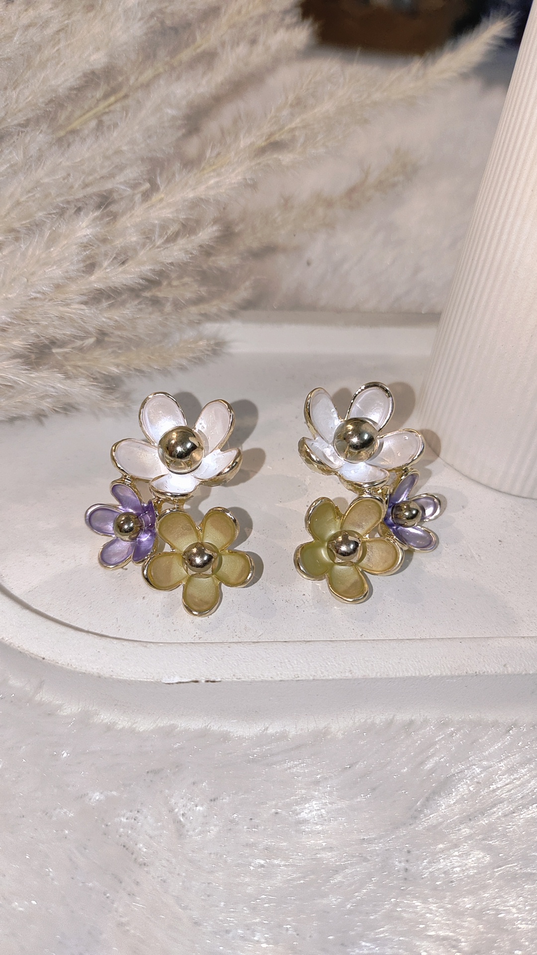Bring a fresh and elegant vibe to your look with these multi floral statement earrings. Crafted with multiple flower motifs outlined in gold, each petal features a glossy finish with a bold metallic bead center, giving the earrings a chic and modern touch.