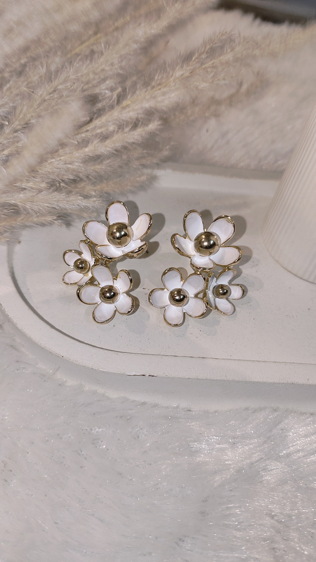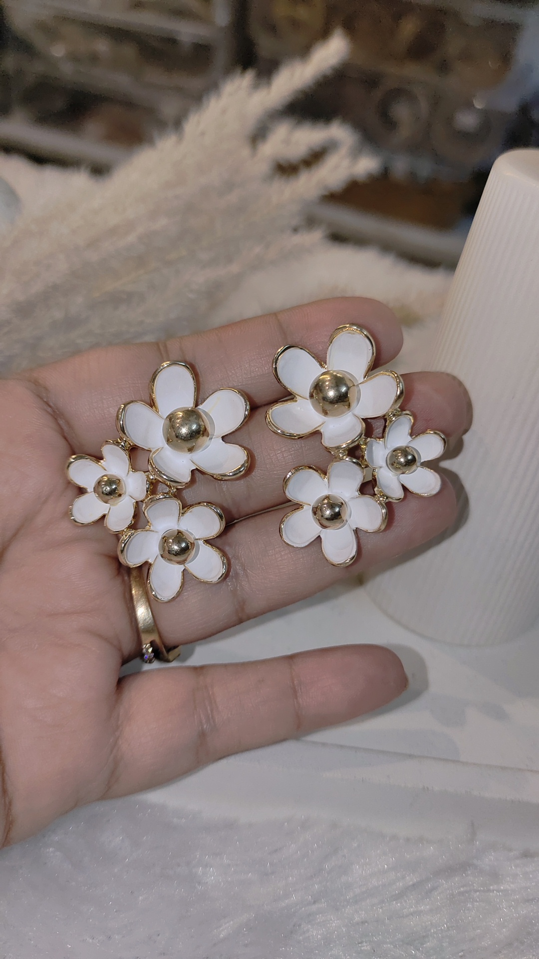 Stylish clustered floral design with white petals and gold accents.